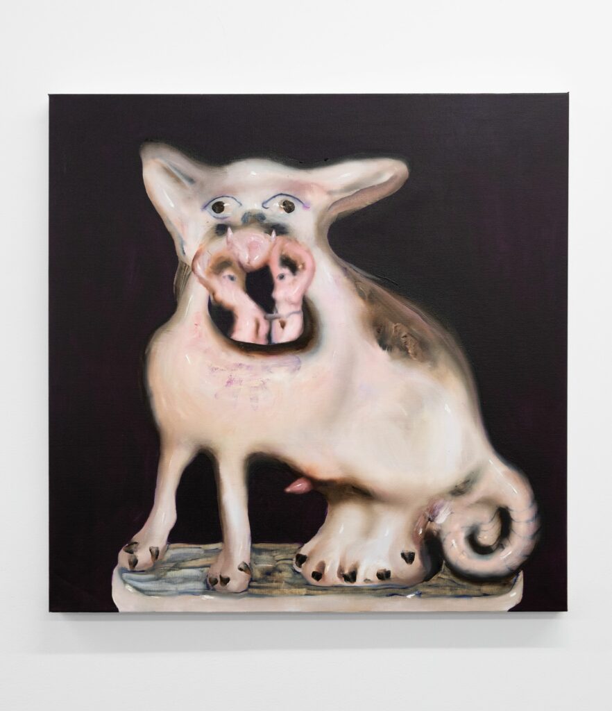 In Ambera Wellmann’s painting UnGodly (2021), an indefinable creature births a trinity of humanlike figures from its mouth. Or maybe it’s consuming them. There are few beginnings and no endings, or many beginnings mistaken for many endings, taking place in the erotic rupture in its face. Gazing nowhere yet everywhere, the seeming mammal, with an invertebrate tail, advances and recedes on a black (fore)(back)ground.